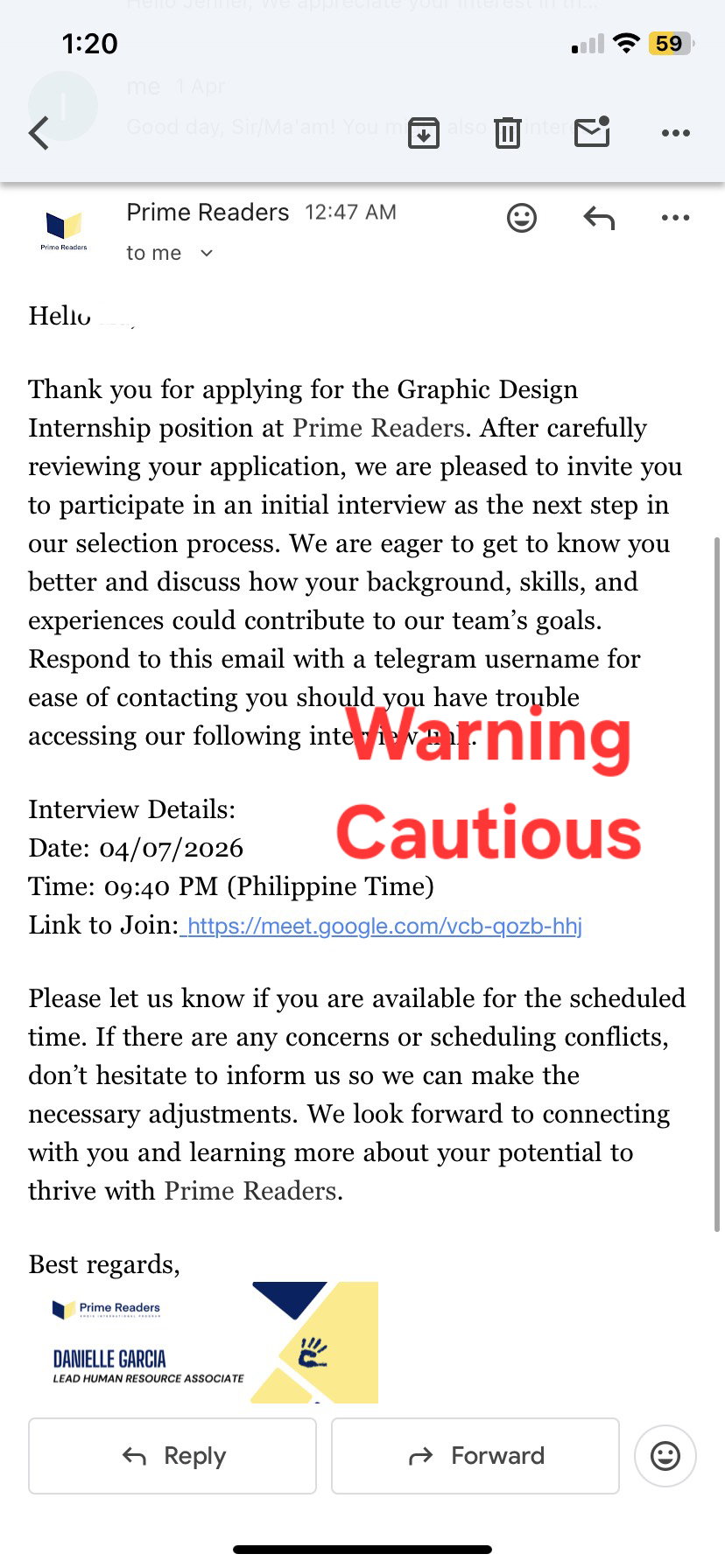 We have identified fraudulent job postings impersonating Prime Readers on Facebook and other platforms since 2025.